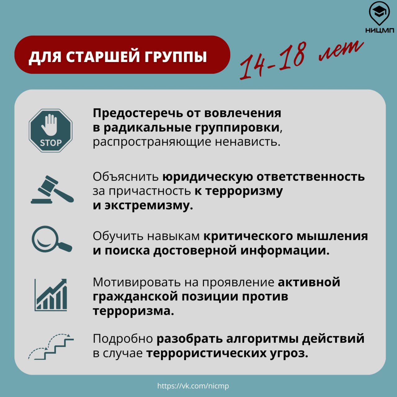 Старшие подростки и студенты нуждаются в глубоком разборе корней терроризма, механизмов вербовки, юридических последствий причастности к экстремизму и терроризму; важно мотивировать их гражданскую позицию против ненависти.
