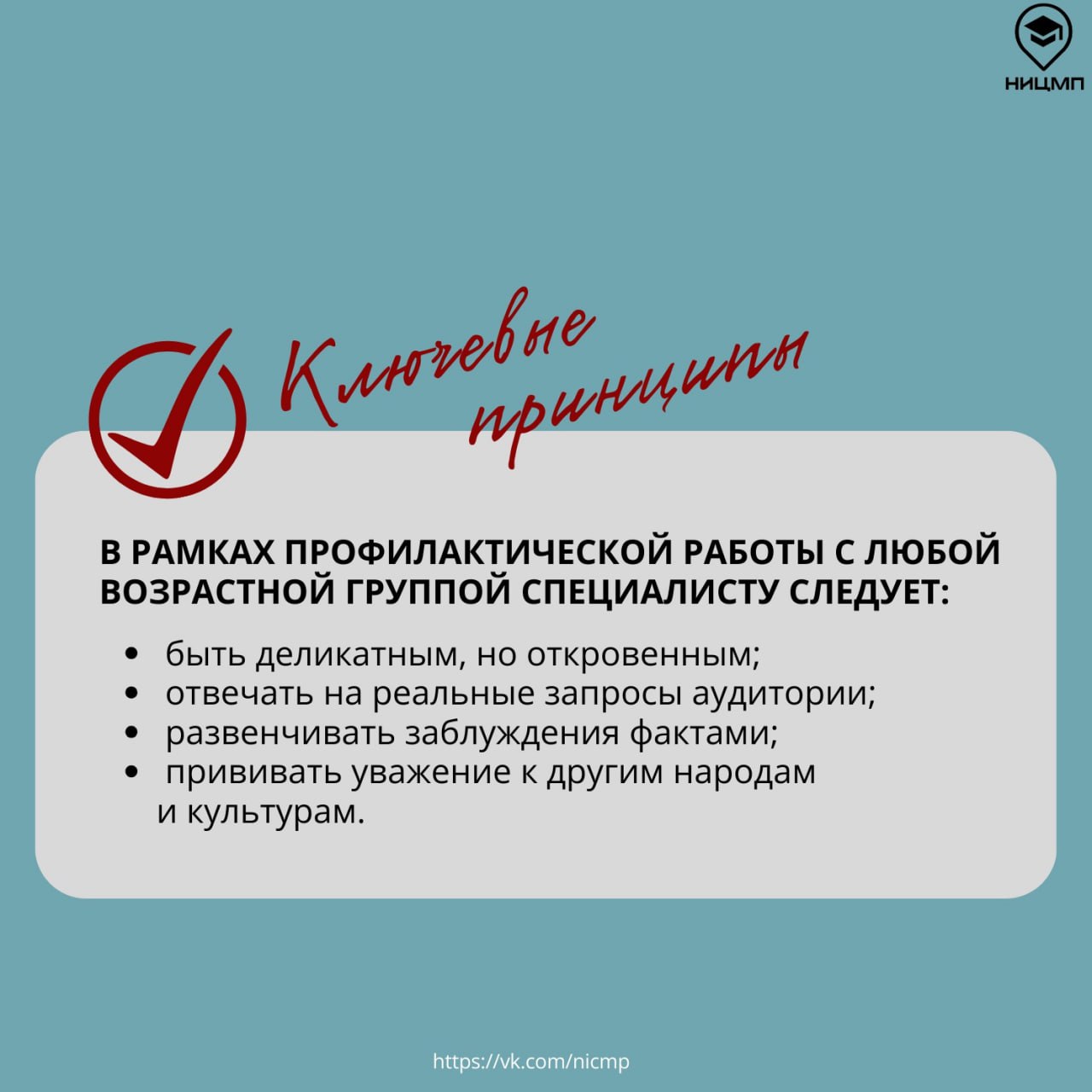 Подростки требуют уже более откровенного разговора, развенчания мифов и заблуждений фактами; особое внимание стоит уделить профилактике их вовлечения в радикальные идеологии.
