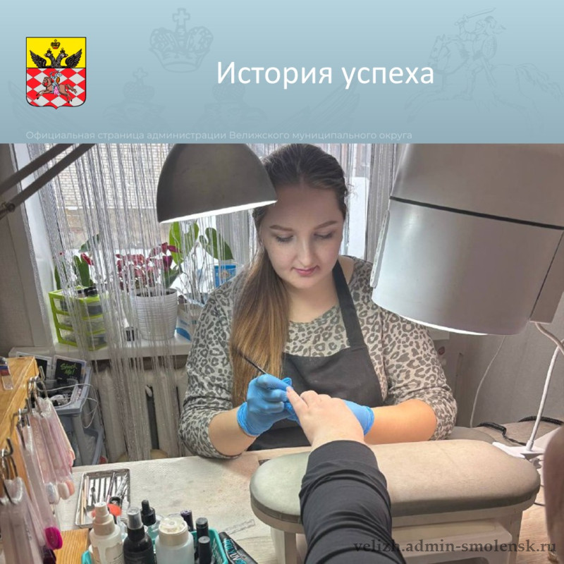 На территории города Велижа функционирует маникюрный салон под руководством Анны Анатольевны Терентьевой, которая получила материальную поддержку при заключении социального контракта на развитие своего дела.