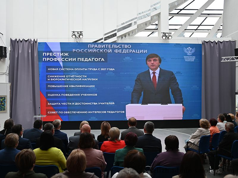 Мероприятие началось с видеообращения Министра просвещения Российской Федерации Сергея Кравцова, где он поблагодарил педагогический коллектив за ежедневный труд, а также рассказал об изменениях и достижениях в сфере образования.