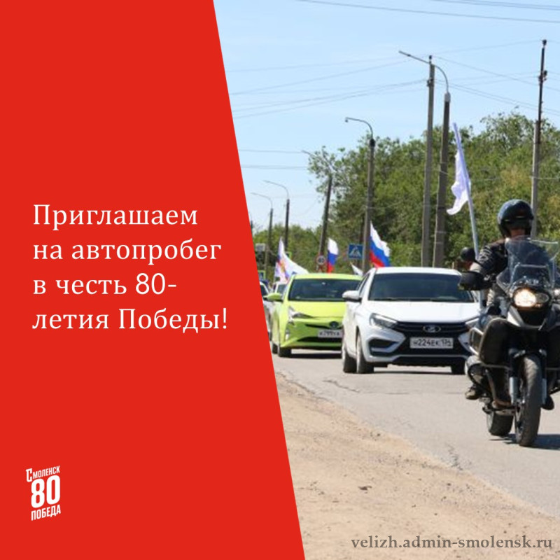 Приглашаем принять участие в автопробеге, посвященном 80-й годовщине Победы в Великой Отечественной войне 1941-1945 годов, который состоится 8 мая 2025 года. Старт в 10.00 от Аллеи Героев-Велижан (центральный парк).