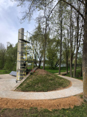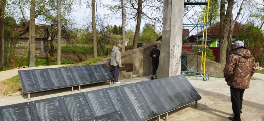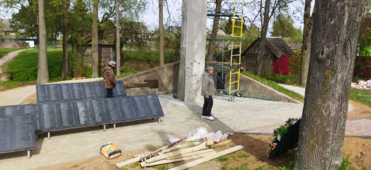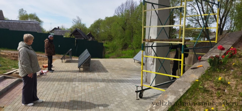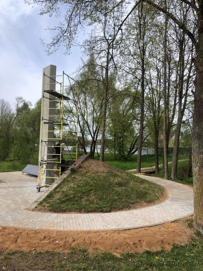 Хорошими темпами идет ремонт памятного места по ул.Курасова. Завершена укладка брусчатки, ведется оштукатуривание стелы.