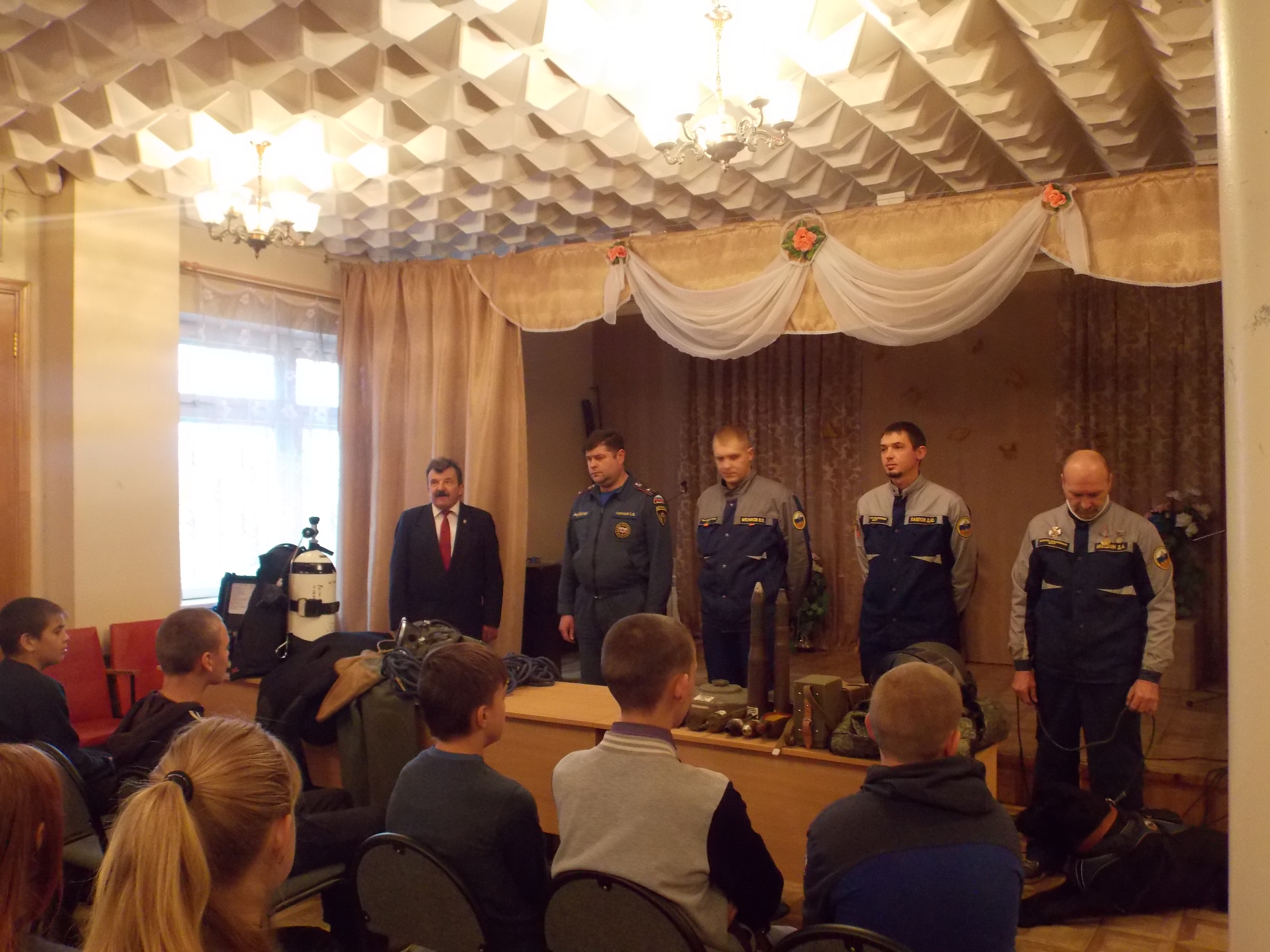- в Районном Доме культуры – выступление с демонстрацией спасательного оборудования и снаряжения начальника поисково-спасательного отряда на водных акваториях города Велижа В.П. Мясникова, ведущего специалиста отряда специальных работ Д.Ю. Павлова, кинолога кинологической службы Д.А. Анушкина профессиональной аварийно-спасательной службы СОГБУ «Пожарно-спасательный центр», с учащимися МБОУ «Селезневская средняя школа», Будницкая основная школа;