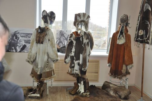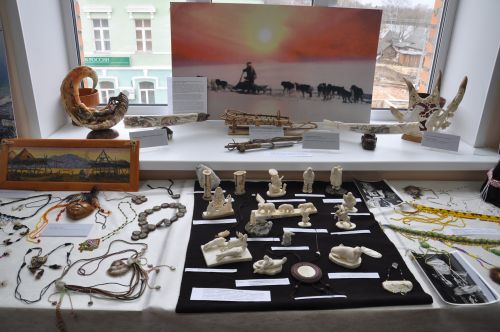 Вызвала интерес коллекция оберегов. Занимательной была экспозиция миниатюрных скульптур, выполненных из клыка моржа, из каменной березы, из кости животных, из рога лосей и даже из бивня мамонта. Деревянные скульптуры, предметы женского творчества: украшения в волосы, сумочки, коллекция ножей, детские работы – все привлекало внимание.