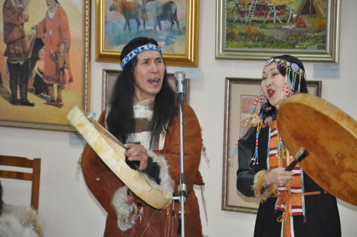 А.С. Суворов представил гостей – Евгению и Владимира – коренных коряков, профессиональных исполнителей обрядовых народных танцев, ставших ярким украшением и изюминкой выставки корякского искусства.