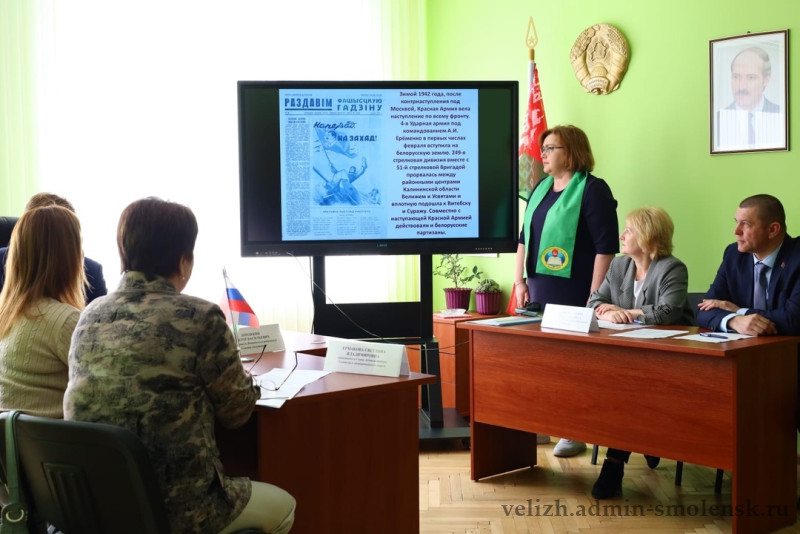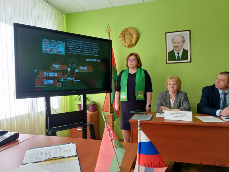 Председатель Витебского районного Совета депутатов Виктор Васильевич Дорожкин познакомил всех участников мероприятия c планом совместного проекта с районами- побратимами, предложив проведение части совместных мероприятий на территориях Суража, Усвят и Велижа. Заместитель Главы Администрации Усвятского муниципального округа Светлана Владимировна Ермакова поделилась информацией о реализации проекта «Край партизанской славы» на территории Усвятского района. Председатель Велижского окружного Совета депутатов Людмила Петровна Осипова рассказала о деятельности поискового отряда «Воин» (командир отряда А.И.Гренко) на территории Велижского района, внесла предложения по реализации совместного проекта.