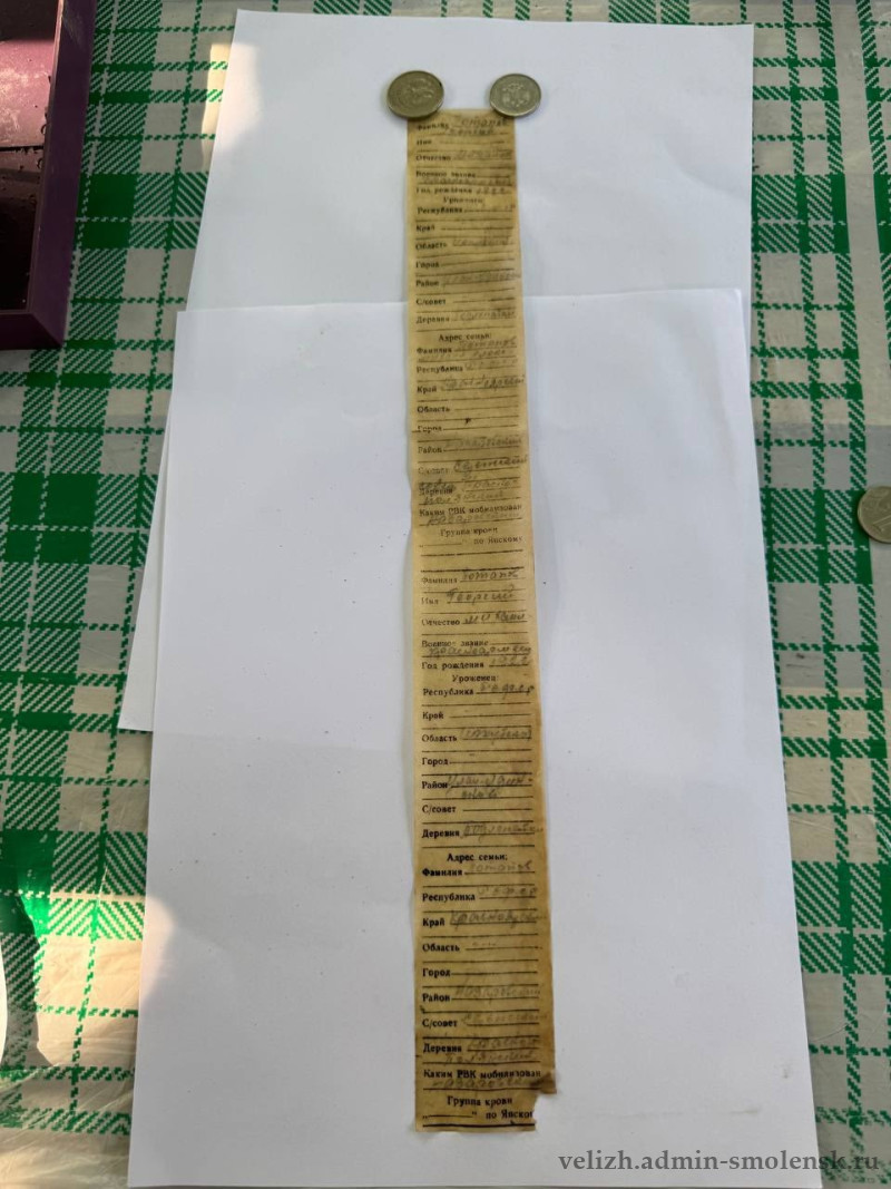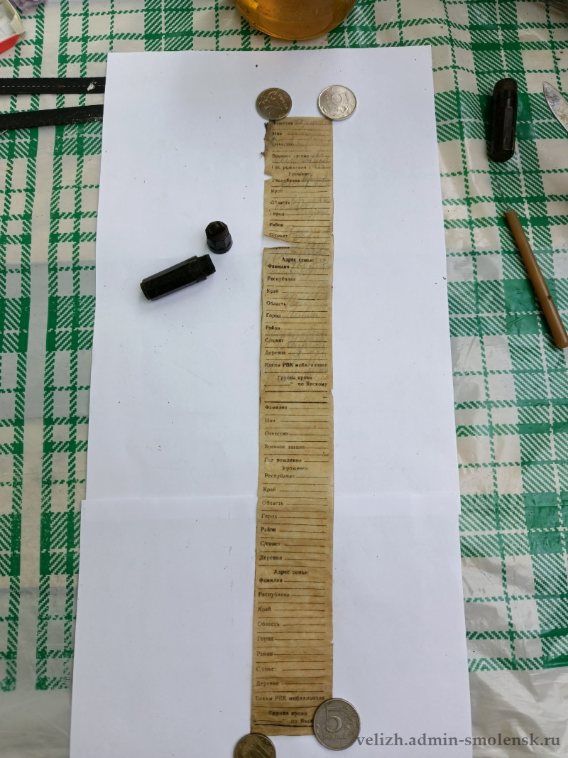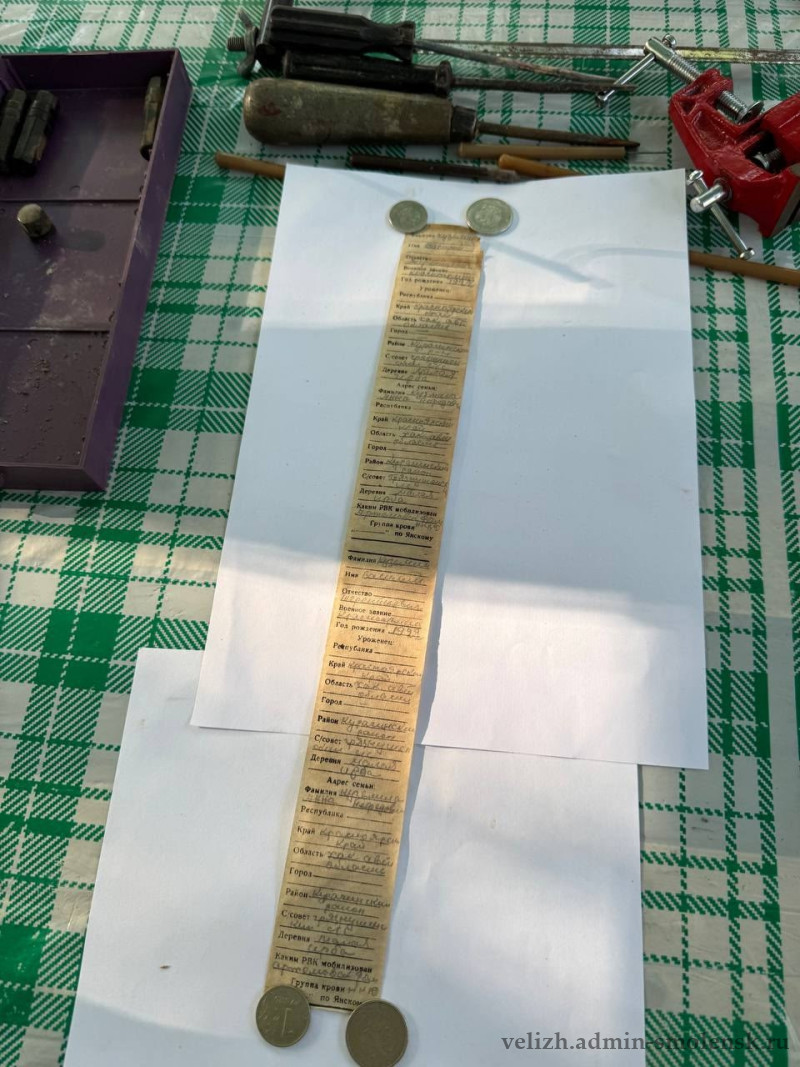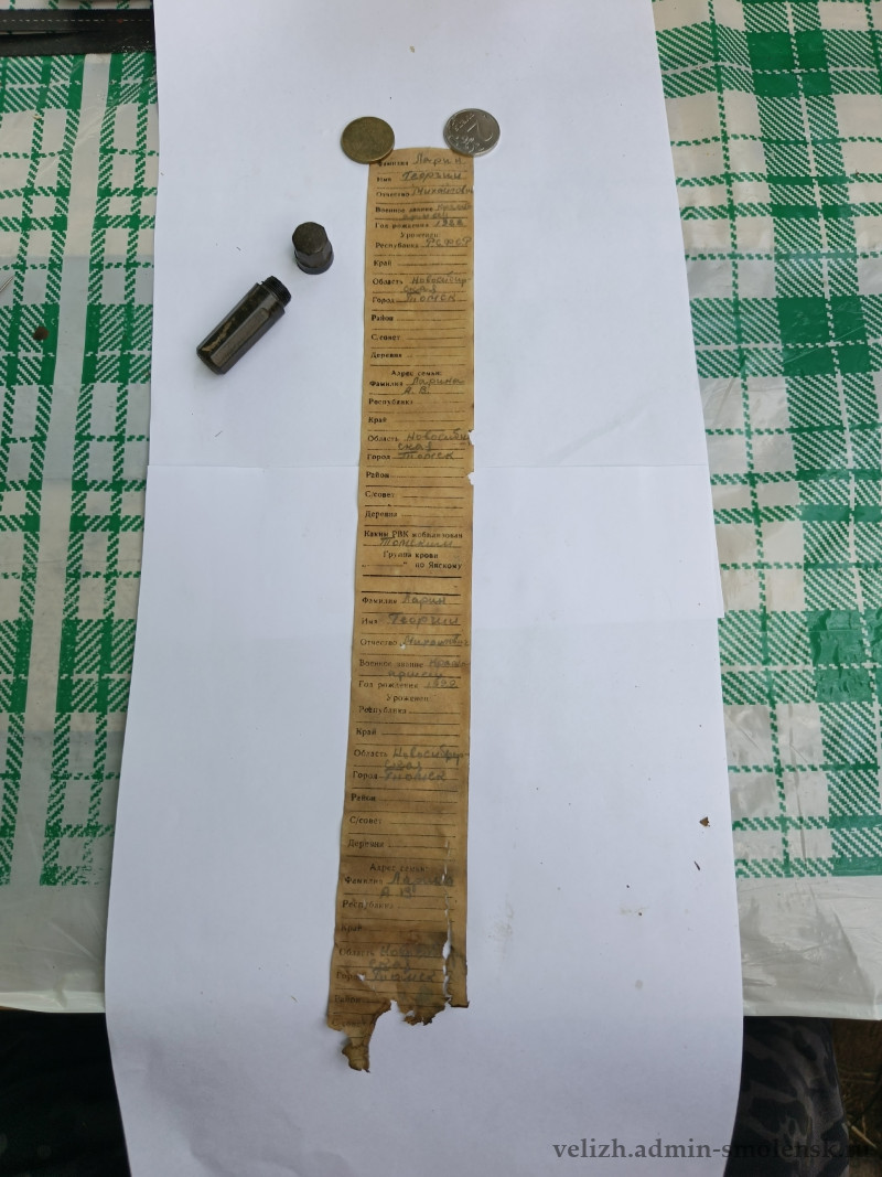 После завершения работ по подъёму останков солдат красной армии в яме, обнаруженной в районе урочища Глубокое, Велижского района, в поисковом лагере производилось вскрытие капсул смертных медальонов обнаруженных у солдат.