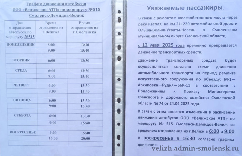 В связи с ремонтом железобетонного моста через автомобильную дорогу Ольша-Велиж-Усвяты-Невель в Смоленской области, с 12 мая 2025 года временно прекращается движение транспортных средств по маршруту №515 Смоленск-Демидов-Велиж.