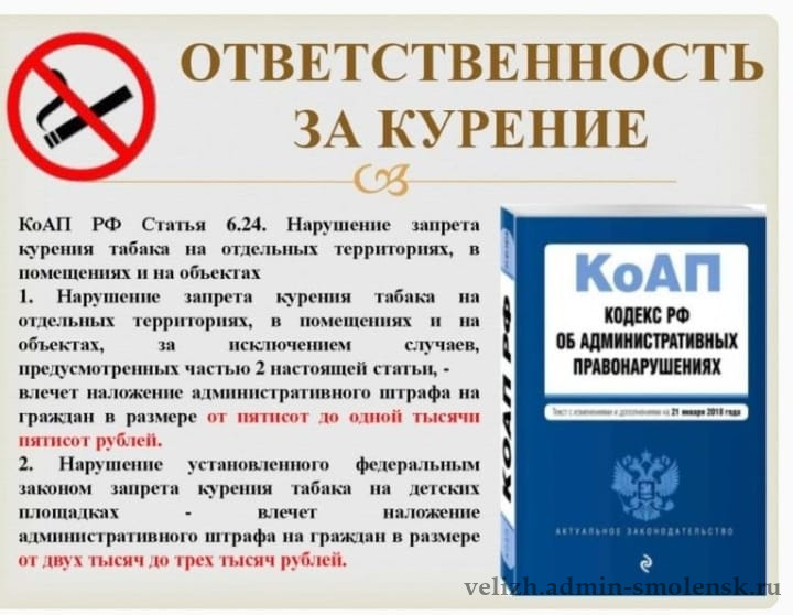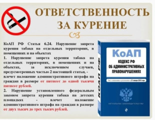 Ответственность за употребление табачных изделий регламентируют статьи 6.23, 6.24 и 6.25 Кодекса об Административных правонарушениях. Согласно КоАП РФ за курение в общественных местах предусмотрена административная ответственность и наказание в виде штрафа. Если запрет на курение нарушил несовершеннолетний, то его могут поставить на учет в ПДН (Комиссию по делам несовершеннолетних).