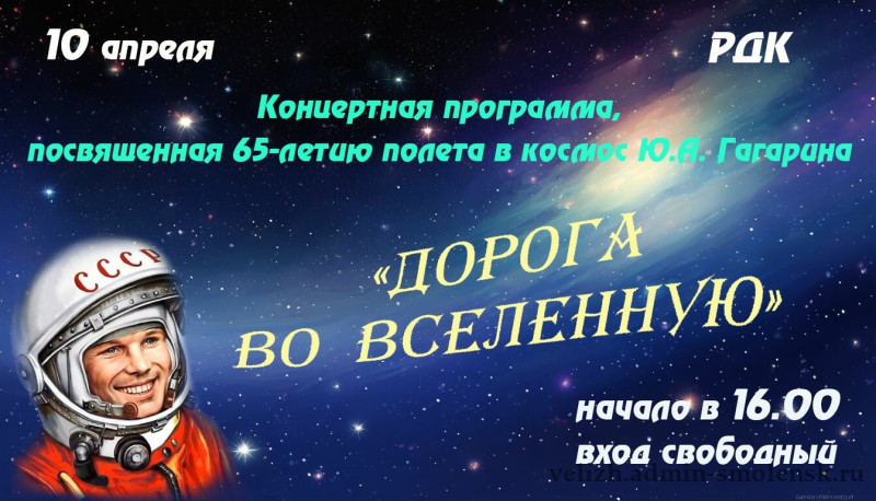 Приглашаем вас на концертную программу «Дорога во Вселенную», которая посвящена знаменательной дате — 65-летию полёта в космос Юрия Алексеевича Гагарина!