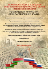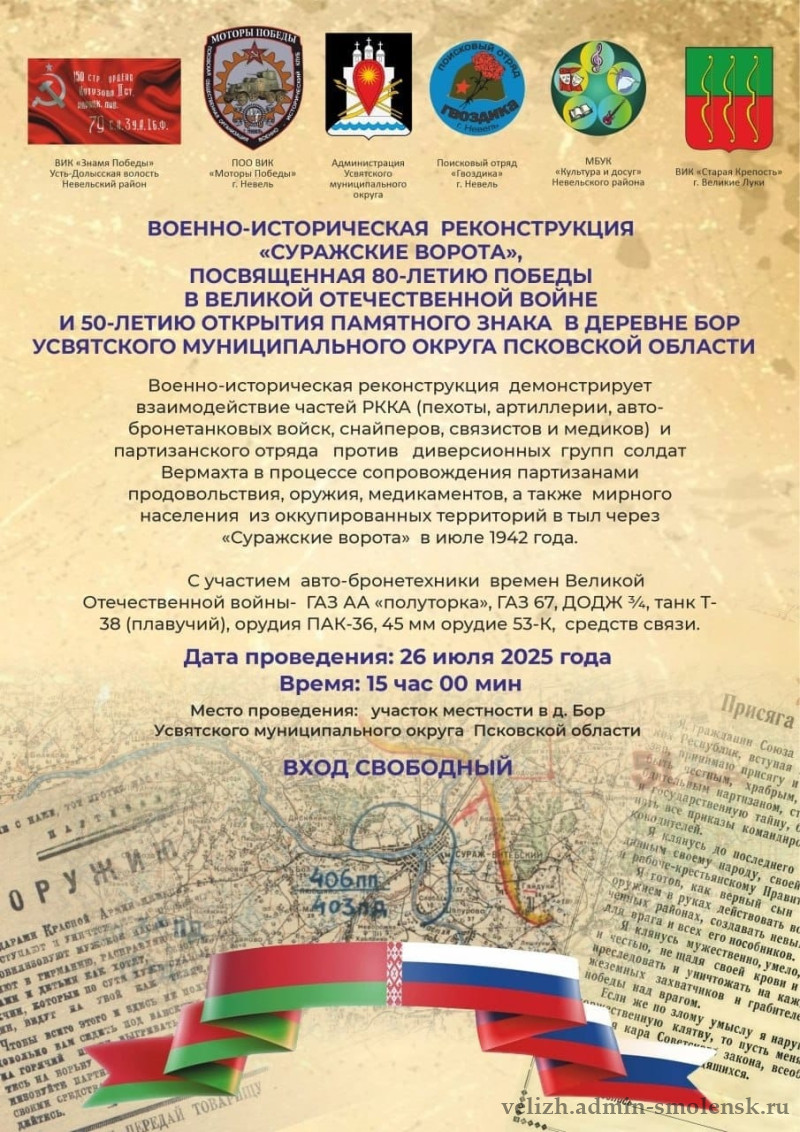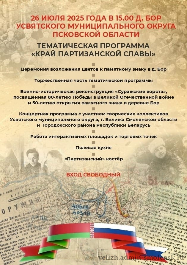 Псковская область приглашает вас на тематическую программу «Край партизанской славы» и военно-историческую реконструкцию «Суражские ворота», которые состоятся 26 июля 2025 года в 15:00 в д. Бор Усвятского муниципального округа.