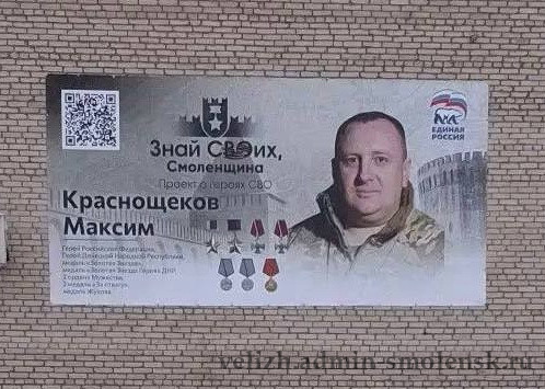 Ко Дню защитника Отечества, в рамках проекта Знай СВОих, Смоленщина!, в Велиже на здании универмага установили баннер в честь Героя России и ДНР Максима Краснощекова.