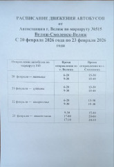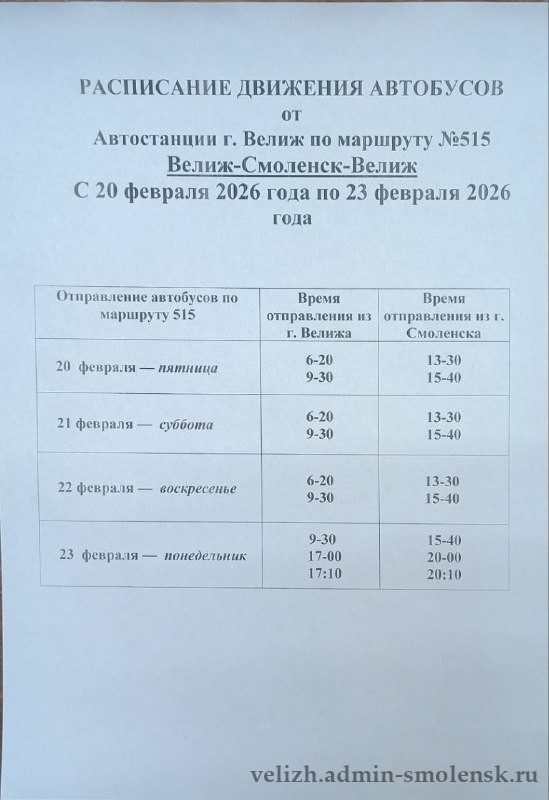 Информируем вас об изменении расписания автобусов по маршруту №515 «Велиж — Смоленск — Велиж» в предпраздничные и праздничные дни с 20 по 23 февраля 2026 г.