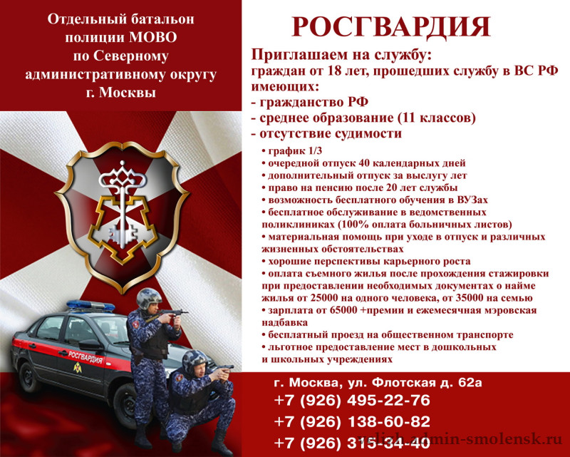 Условия службы:— Участие в группах задержания;— Работа на территории Северного административного округа г. Москвы;— Обеспечение правопорядка и общественной безопасности.